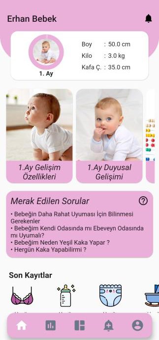 Uygulamamız, yeni doğan bebeğinizi büyütürken kullanışlı ve güvenilir bir asistan görevi görür. Emzirmeyi, biberonla beslemeyi, ek gıda ile beslemeyi ve süt pompalama aktivitelerini takip edebilirsiniz. Bez değiştirme sıklığını, uyku periyotlarını ve bebeğinizin boy ve kilo ölçüm sonuçlarını, ateş ölçümlerini, aktivitelerini, aşı ve diş takvimini kaydedebilirsiniz!